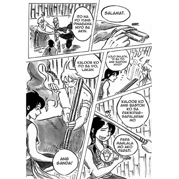 Out of one section came a golden-bronze colored man named Malakas Strong One and from the other half came a similarly hued woman named Maganda Beautiful One. They are born out of a bamboo stalk that is cracked open by a bird. Si malakas at si Maganda.